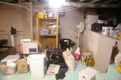 I organized and shifted a bunch of things that were in the elevated storage space to the right (and also got rid of a lot of things), then Lisa's boxes and bags were shifted into that cubby as well. The pantry shelves were inventoried and reorganized, and the clotheslines were taken down (we used them once before discovering that it takes about two weeks for any laundry to dry in the basement, and started hanging the wash up in the garret). The small box to the left of the shelves is our "to donate" box that is now full and ready to go to a thrift store.